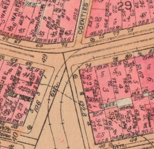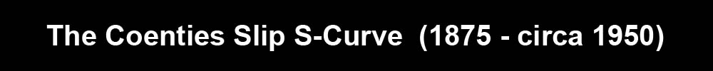 The Coentis Slip "S-Curve" is often seen in documentaries about the early days of the elevated subway lines in Manhattan. The quick S-turn executed extremely close to a group of buildings, followed by the train seeiming to disappear into lower Manhattan's canyons around a bend, make it a particularly effective piece of New York visual history. One place the scene was recently popularized was in a video for the song "New York I Love You But You're Bringing Me Down," by the group LCD Sound System. The clip was edited by Thomas Cazales using part of a film made in the 1940's by Carson Davidson entitled Third Avenue. You can see the clip beginning at the 1:00 minute mark, by clicking here: (New York I Love You. . .clip) I will put this link at the end of the entry also in case you want to read through the entry first. About Coenties Slip ( From UNTAPPED CITIES) : An in-depth look at the S-curve from a 1935 Bromley map of New York City: