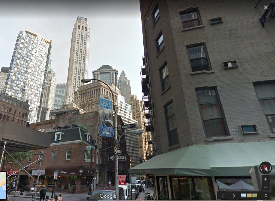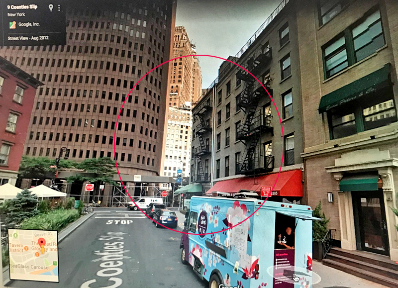 And here's that same spot (circled) today. (The building address is 2 Coenties Slip, aka 74 Pearl Street.)