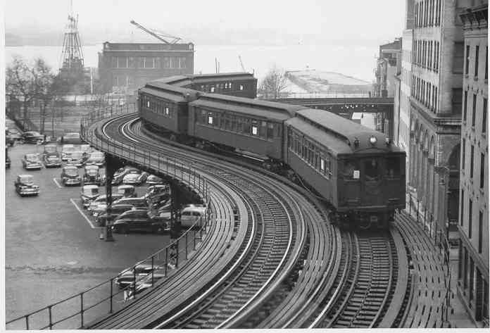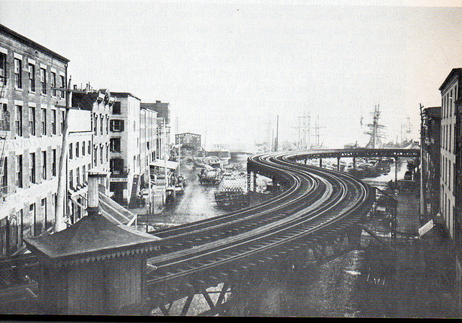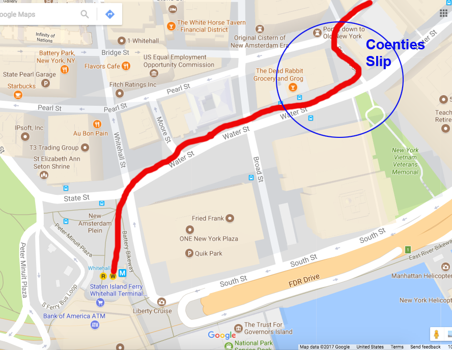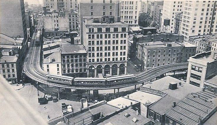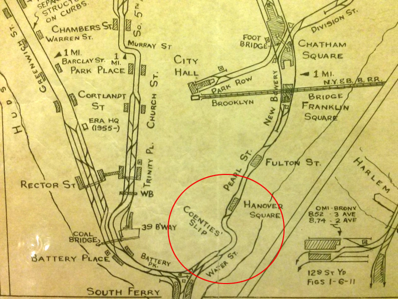 Both the 2nd Avenue EL and the Third Avenue El used this stretch of tracks. The train split a little further north at Chatham Square next to Chinatown. The Coenties Slip "S-curve" is circled in this photo. The trains started by South Ferry at the bottom tip of the island.