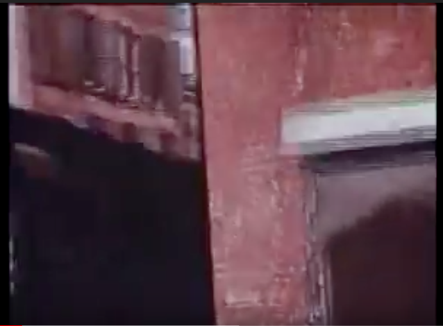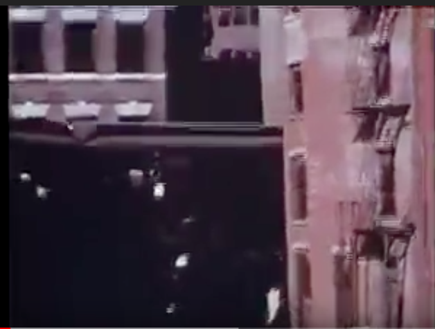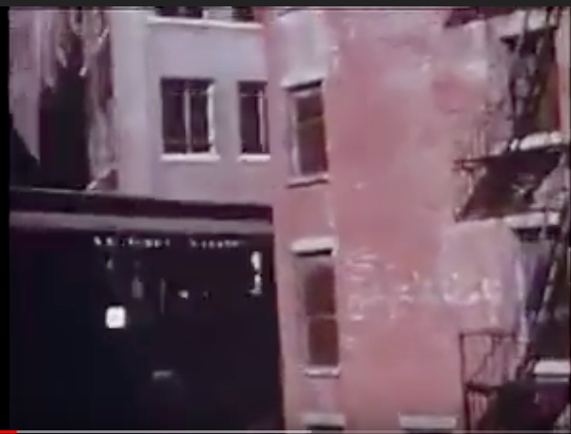 Here is that same location, but in color, from an old documentary. The dark area on the lower left is a train going behind the corner of the building.